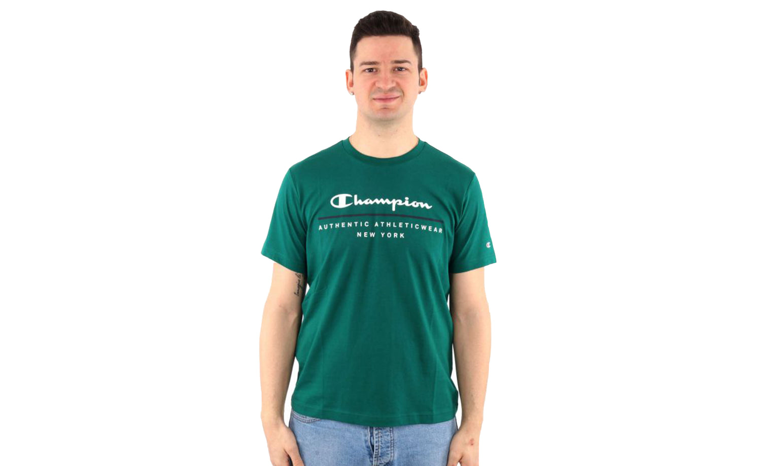 • Diseño principal con el logo de Champion estampado en la parte frontal del pecho. Logo de la marca en la manga izquierda.